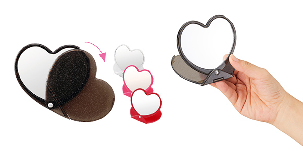 細かなラメ入りのボディとハート型が抜群にキュートなコンパクトミラーです。持ち歩きに傷が付きにくいスライドタイプの蓋が付き、折り返してスタンドとして使用が出来ますので手放しで身だしなみを整えられます。女性から人気の多いハート型ミラーはイベント物販やキャンペーンノベルティなどの特注製作に多く活用されています。オリジナル制作専門店である当ノベルティ・ギフトモールでは大量注文も特別価格でご提案させて頂きます!