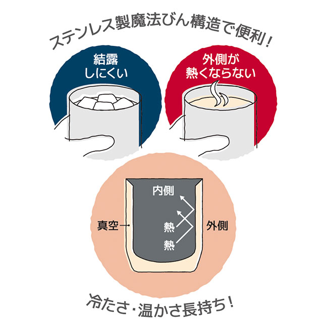 4種類のカラー展開はお母さん、お父さん、こども、祖父母とファミリーで使いやすく不動産関連の成約記念やアウトドア系店舗での販促ノベルティなどに活用されています。各色で名入れを施した特注製作を行えば単品だけでなくセット使いも出来ますのでオススメです。ステンレス製魔法びん構造で保温・保冷効果抜群のカップです。