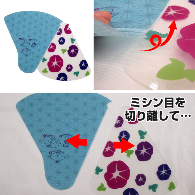 ミシン目を切り離す事で2つに分かれます。そして、二つに分かれたシートを絡み合うように差し込み組み合わせる事でPP扇子が完成いたします。扇ぎやすく使用しない際には、また取り外す事でコンパクトに収納が出来、移動の際にも便利な夏向けのノベルティグッズとなります。