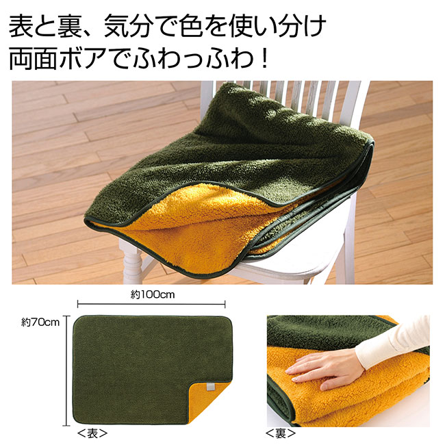ふわふわの両面ボアで、寒い冬も暖かく過ごせる「ダブルボアブランケット」。表と裏で色が違うので気分に合わせて使い分けることができます。使いやすい落ち着いた色合いなので、ファミリーやOLなど幅広い世代向けに活躍します。縫付けタグに名入れ印刷が可能ですので、ショップロゴや企業名を入れたオリジナルノベルティ作成にご活用ください。冬季のイベントやキャンペーンなどにお薦めです。